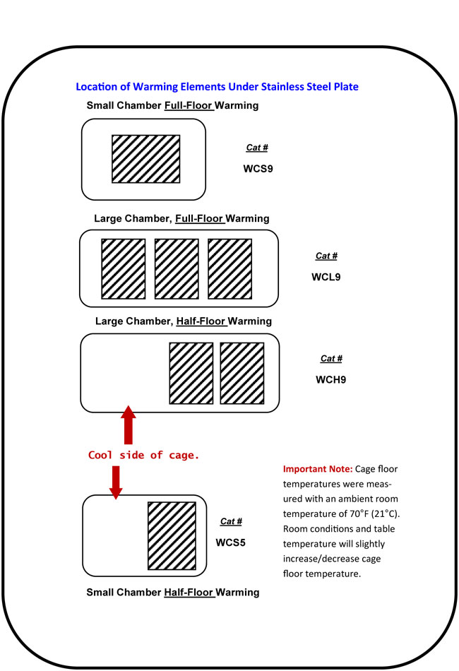 Important Note: Cage floor temperatures were measured with an ambient room temperature of 70°F (21°C). Room conditions and table temperature will slightly increase/decrease cage floor temperature.